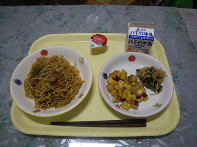 ソース焼きそば 牛乳 キャラメルポテト もやしのあえもの りんごのひとくちゼリー