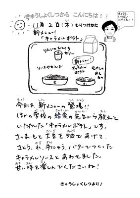 他校の栄養士さんに教えていただいた「キャラメルポテト」が好評でした。早速「作り方を教えて!」というリクエストが、リクエストボックスに入っていました。うれしかったです。