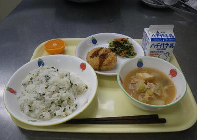 わかめご飯 牛乳 おからコロッケ ごまあえ 具だくさんみそ汁 花みかん