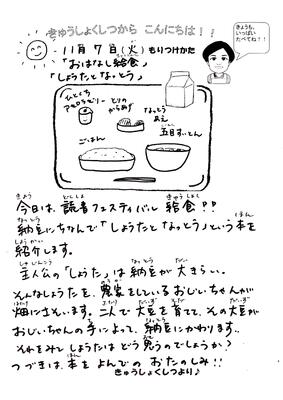 今日もおはなし給食として、納豆あえにちなみ「しょうたとなっとう」という本を紹介しました。