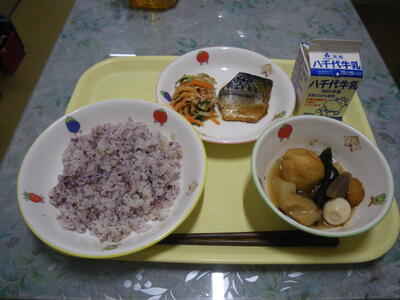 ゆかりごはん 牛乳 さばのみそ煮 小松菜のマヨネーズ和え 一口おでん