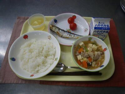 ごはん 牛乳 さばの塩焼き(4年生と3の4は、いわしの塩焼き) ミニトマト 豚汁 はちみつレモンゼリー