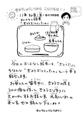 読書フェスティバル最終日、おはなし給食として「ぎょうざつくったの」という本を紹介しました。