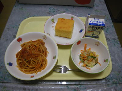 スパゲティミートソース 牛乳 コーンサラダ ぐりとぐらの米粉カステラ