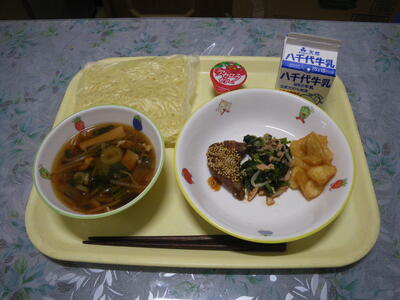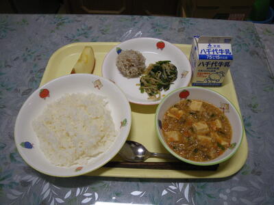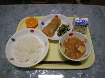 ごはん 牛乳 切り干し大根の春巻き もやしとわかめの中華和え 家常豆腐 花みかん