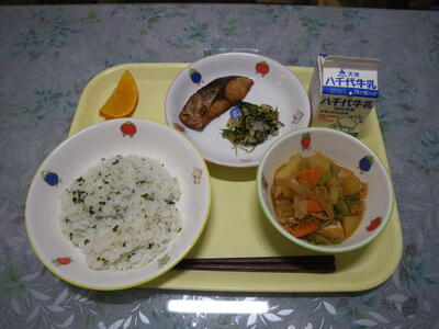 わかめご飯 牛乳 いなだの照り焼き 白菜のゆず香和え 肉じゃが オレンジ(紅まどんな)