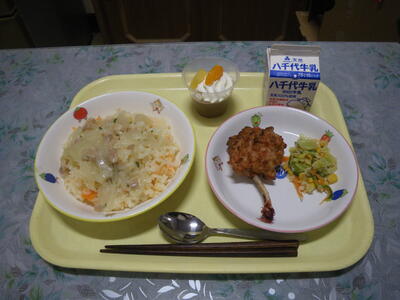 キャロットライスホワイトソースかけ 牛乳 ワンピースの骨付き肉 コーンサラダ チョコレートプリン