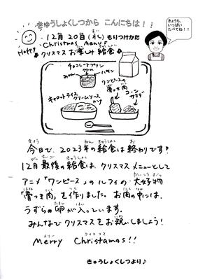 2023年最後の給食は、華やかにクリスマスお楽しみ給食で締めくくりました。チューリップ型の鶏肉に、ゆでたうずら卵を入れ、そのまわりに豚ひき肉の生地をつけて焼いた「ワンピースの骨付き肉」。作業は手間がかかり、とても大変でしたが、みんなうれしそうに食べていました。みんなで、クリスマスをお祝いしました!!