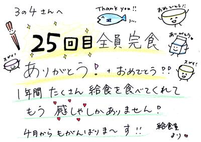 毎回全員完食をめざしていたクラスが、見事給食終了まで通算25回全員完食を達成して、すてきなお手紙をくれました。給食室からも、お礼のお手紙を贈りました。ダブルでうれしい、給食最終日となりました!!