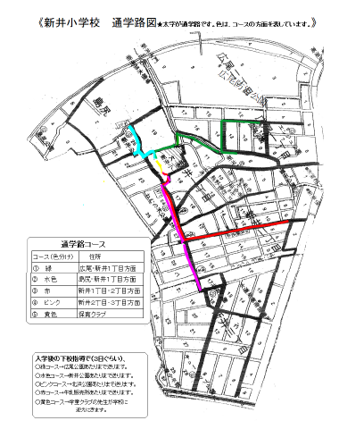 下図の太線(赤)が通学路です。新井小では、通学路を地区ごとに5つのコースに分けています。わかりやすくするために、コース毎に色分けをしています。自分のコ-スの色をしっかり覚えて登校できるようお願いします。