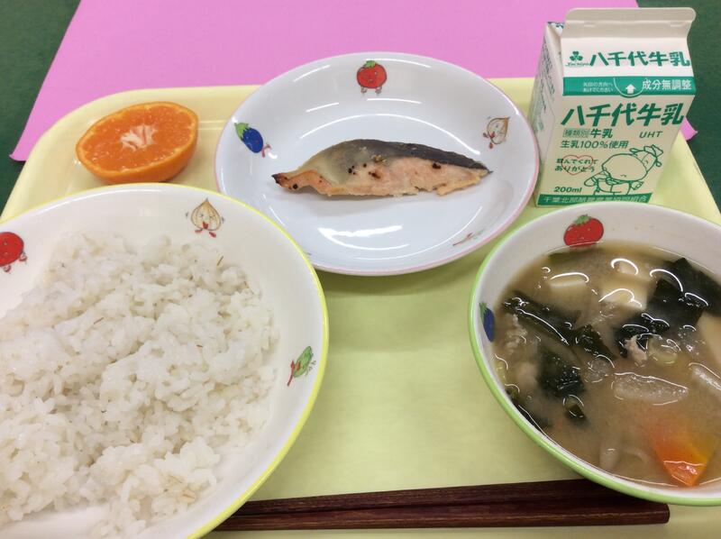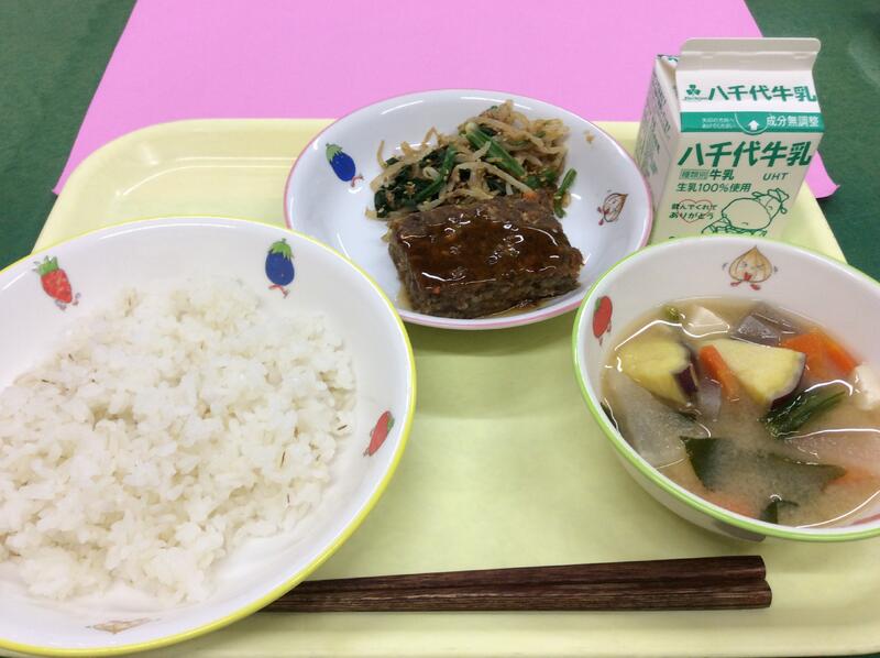 ごはん、サツマイモの味噌汁、イワシのさんが焼き、ほうれん草の香味和え、牛乳 です!