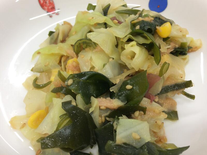ごはん、ジャガイモとわかめの味噌汁、ちぐさ焼き、梅肉和え、生海苔のつくだ煮、牛乳 です!
