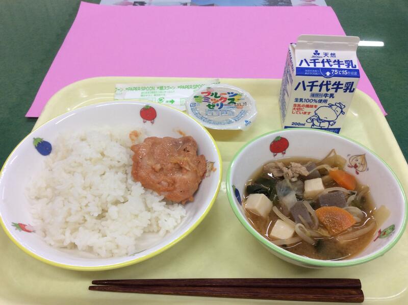 ごはん、とり肉の西京焼き、ピリ辛スープ、フルーツゼリー、牛乳 です!