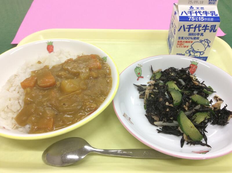 チキンカレーライス、ひじきとハムのマリネ、牛乳 です!