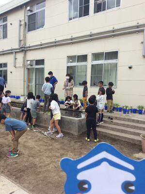 まだ気温が高くならないうちに一年生が水遊びを行いました。