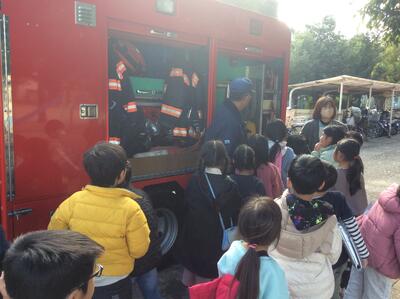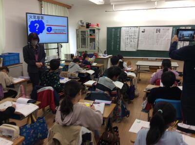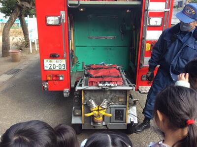 3年生、1年生は社会科、国語科の学習として消防車の見学をしました。