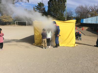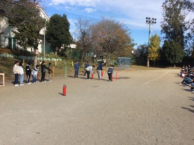 避難訓練のあと、消火器を使って消火訓練を行いました。