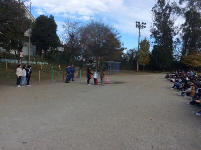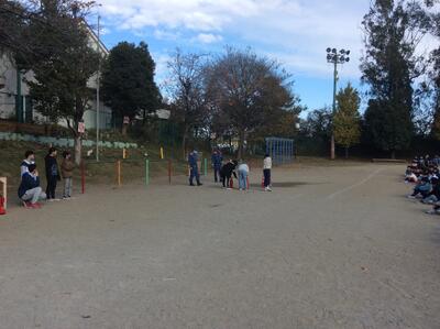 校庭で2年生がサッカー型のボール運動に取り組んでいました。