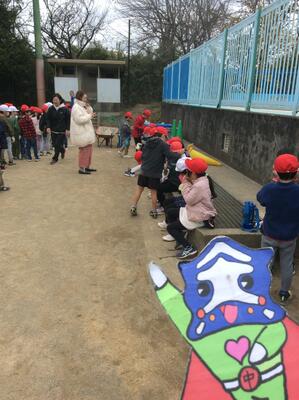 避難訓練のあと、消火器を使って消火訓練を行いました。