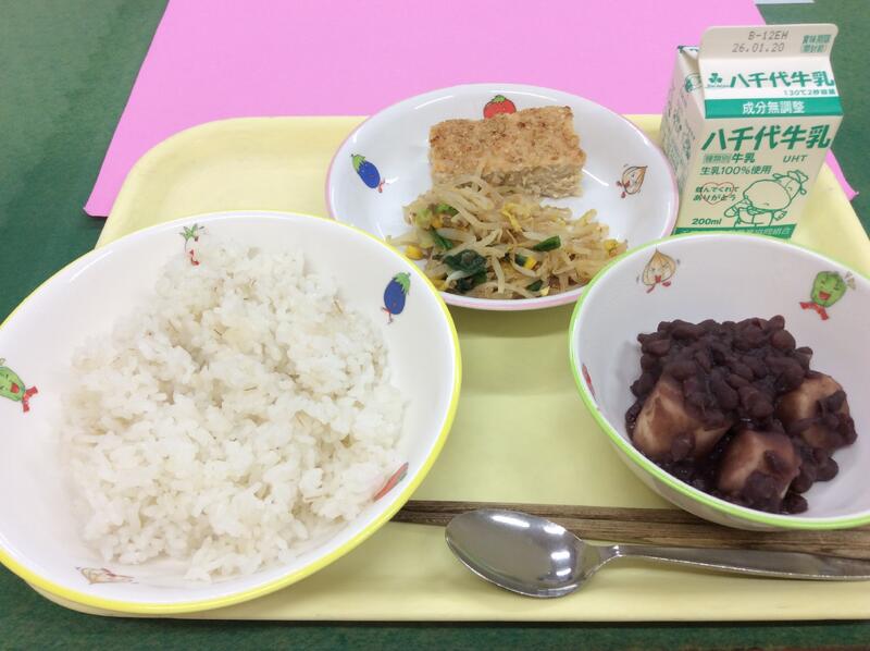 ごはん、松風焼き、コーンおかか和え、お汁粉、牛乳 です!