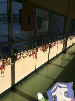 渡り廊下に飾られている1年生が作ったリースです。