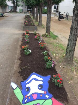 用務員さんが花壇を整備し、委員会の子どもたちが花を植えました。