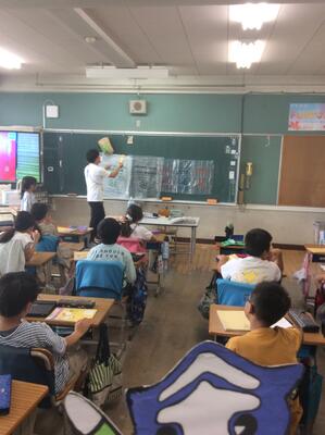 ごみ袋を提示し、ごみの分別から授業に入りました。