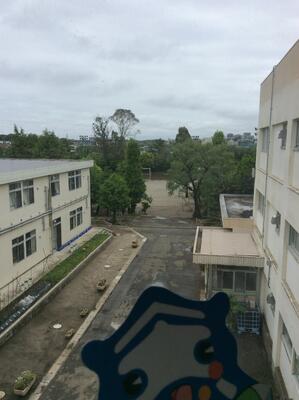 校庭の大きな水溜まりが雨量を物語っています。