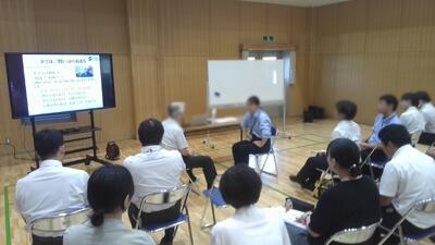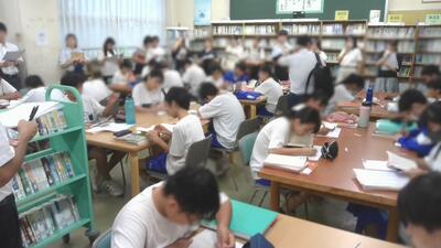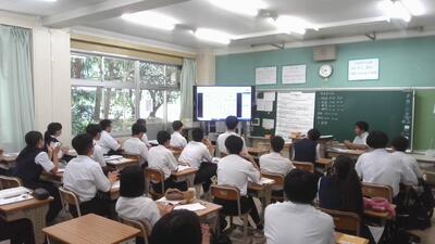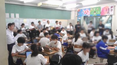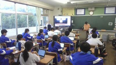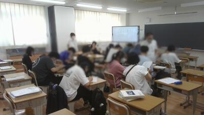 今日は3年生で、5、6校時に進路講演会を実施しました。近隣の公立高校や私立高校の先生に来ていただき、教室でお話いただきました。他のクラスや保護者の方の別室にも、同時にリモートで配信しました。高校の紹介だけでなく、受験に向けての心構えや夏休みにしておくべきことなどを丁寧に説明していただきました。