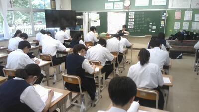 3年生は受験に向けて学習の定着を確認するための到達度テストを行っていました。問題に向かう真剣な姿が見られました。