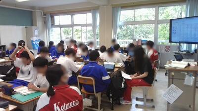 本日は単元の復習をやりました。大型提示装置に復習問題とその答えが四択で出され、各自が自分の端末から回答してその回答の正解数がランキングに出されていました。復習をしながらランキングも競っていました。一通り問題が終わった所で改めて大切な点を先生が説明しました。みんな端末の操作は上級です。