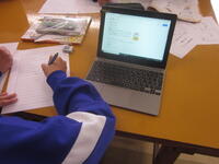 本日は単元の復習をやりました。大型提示装置に復習問題とその答えが四択で出され、各自が自分の端末から回答してその回答の正解数がランキングに出されていました。復習をしながらランキングも競っていました。一通り問題が終わった所で改めて大切な点を先生が説明しました。みんな端末の操作は上級です。