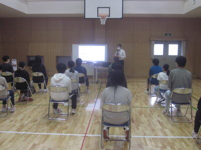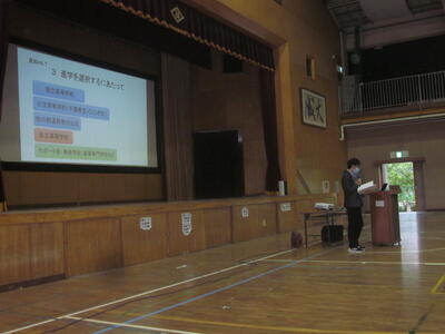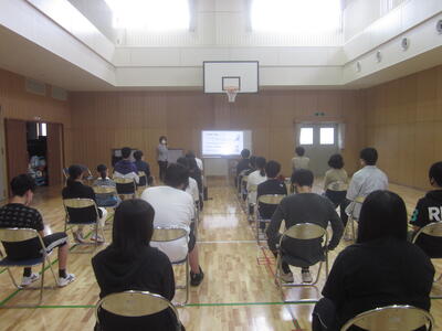 今日は3年生で、5、6校時に進路講演会を実施しました。近隣の公立高校や私立高校の先生に来ていただき、教室でお話いただきました。他のクラスや保護者の方の別室にも、同時にリモートで配信しました。高校の紹介だけでなく、受験に向けての心構えや夏休みにしておくべきことなどを丁寧に説明していただきました。