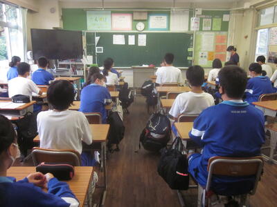OC室と各教室をチームスでつなぎ行いました。内容は校長講話、表彰、夏休みの生活、3年生代表生徒による修学旅行事後報告、2年生代表生徒による職場体験事後報告を行いました。各学年とも発表は素晴らしいものでした。