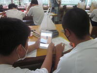 今日は図書館で夏休みに借りる本を探して試し読みをしました。この読書が一中図書館大賞につながります。