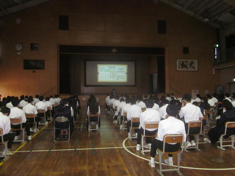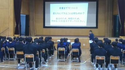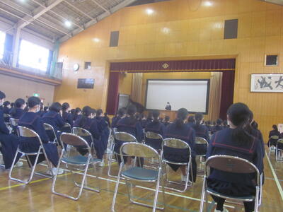 2学期に締め括りとして1時間目3年生が体育館で学年集会を行いました。卒業式までこれから時間を守ること、言葉遣い等改めて確認しました。その後、県立高等学校のインターネット出願等について話がありました。3年生はこれから健康管理が一番です。上手に時間配分しながら各自の目標に向かってください。本日はこの後、他の学年も学年集会で2学期の振り返りをします。