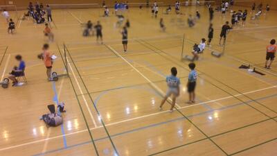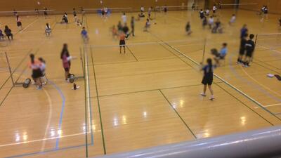 体育館で2年生が学年レクリエーションをやって親睦を深めていました。写真は借り人競争の様子です。体育館は大き歓声に包まれていました。