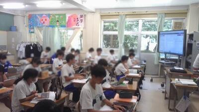 本日は単元の復習をやりました。大型提示装置に復習問題とその答えが四択で出され、各自が自分の端末から回答してその回答の正解数がランキングに出されていました。復習をしながらランキングも競っていました。一通り問題が終わった所で改めて大切な点を先生が説明しました。みんな端末の操作は上級です。