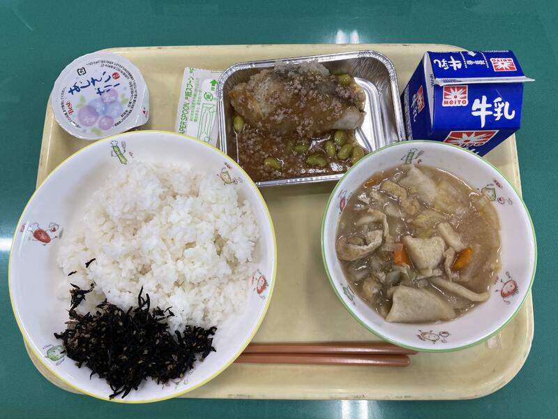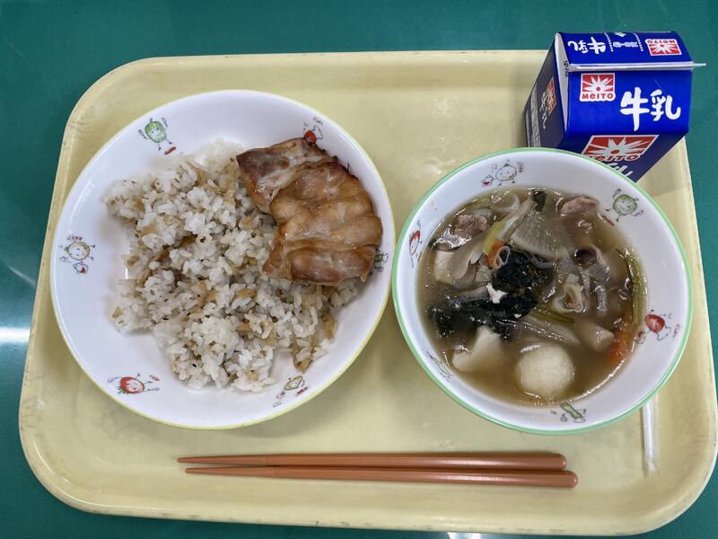 生姜ごはん、鶏肉照り焼き、だまこ汁、牛乳