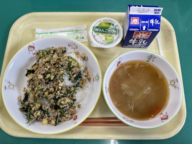 ご飯、三色そぼろ丼の具、はっぽうみそ汁、あおりんごゼリー、牛乳