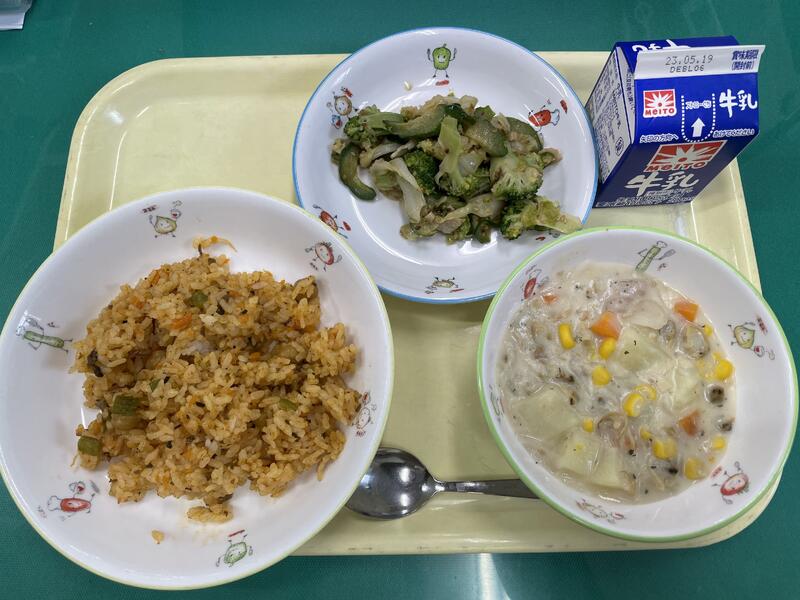 ジャンバラヤ、コーンクラムチャウダー、ブロッコリーのごまドレ、牛乳