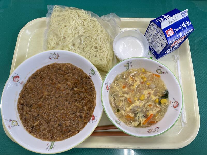 ジャージャー麵、中華風コーンスープ、牛乳寒天、牛乳