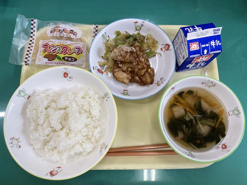 ご飯、鶏肉の薬味ソース、キャベツのじゃこ和え、すまし汁、クレープ、牛乳