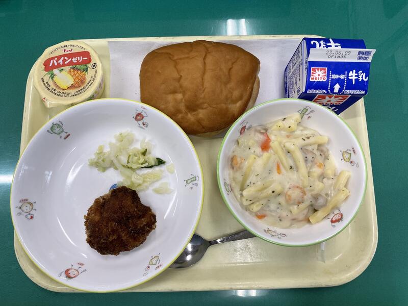 カツサンド、マカロニのクリーム煮、パインゼリー、牛乳