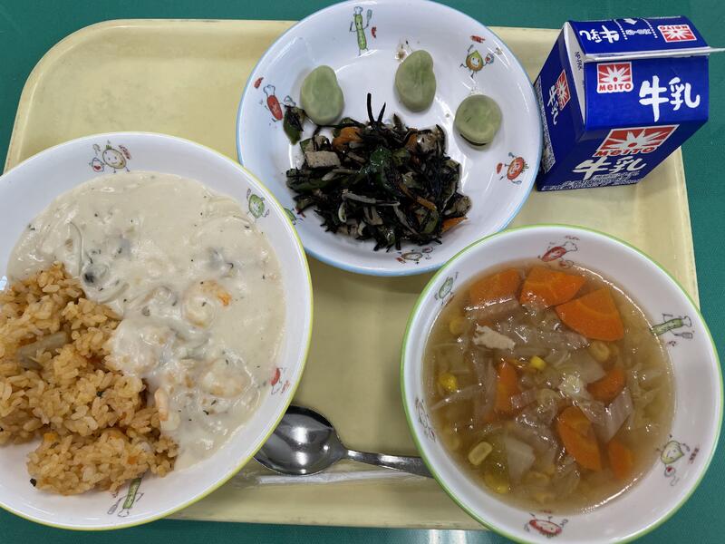 チキンピラフのクリームかけ、ひじきのマリネ、野菜スープ、そら豆、牛乳