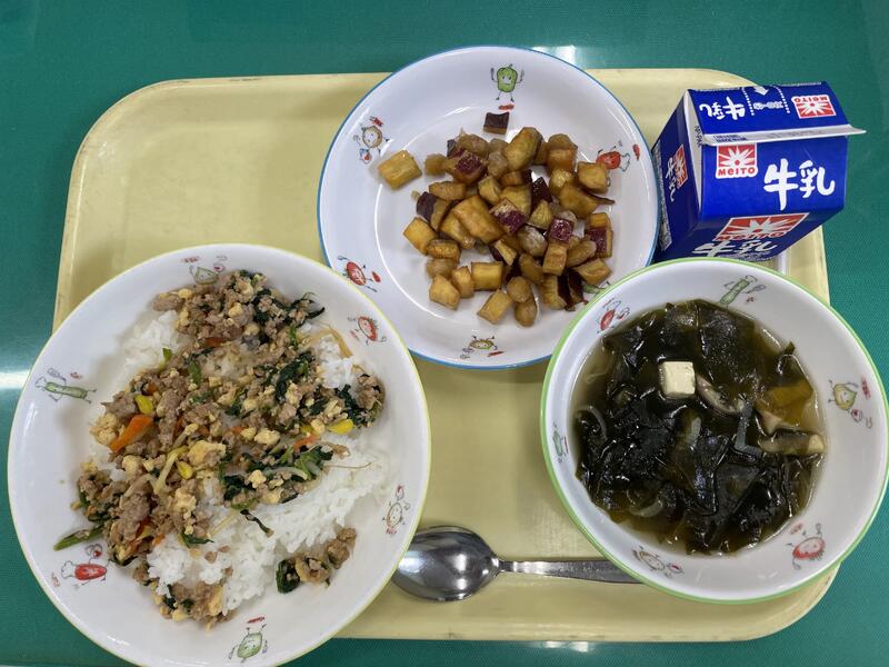 キムタクご飯、中華オムレツ、切り干し大根の中華スープ、タルト、牛乳