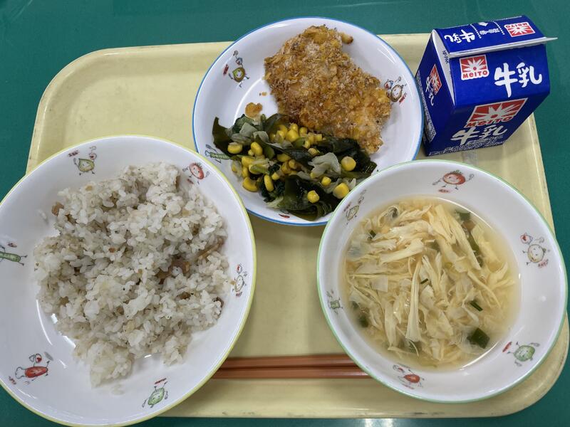 たけのこご飯、魚の竜田揚げ、ごま和え、すまし汁、柏餅、牛乳