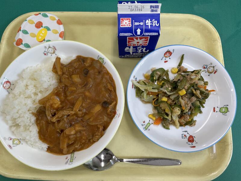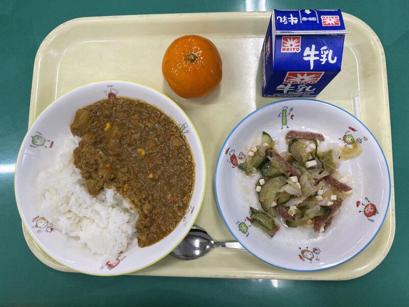 ご飯、コーンキーマカレー、イタリアンサラダ、冷凍ミカン、牛乳