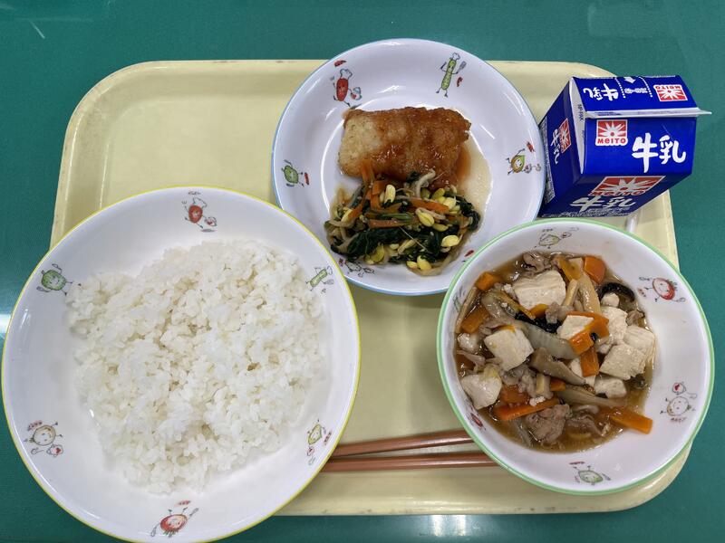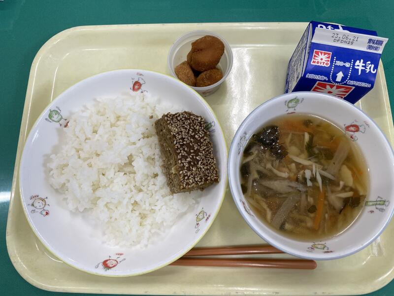 ご飯、豚肉のかりんと揚げ、磯香和え、大根のみそ汁、牛乳