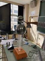 2年生の理科の実験では、なにやらあやしげな球体が…。この球体に静電気をためると放電現象が観測できます。興味のある人はバンデグラフで検索してみてください。私も理科の教師でしたが、過去の勤務校にはこの実験装置はなかったです。うらやましいなあ。